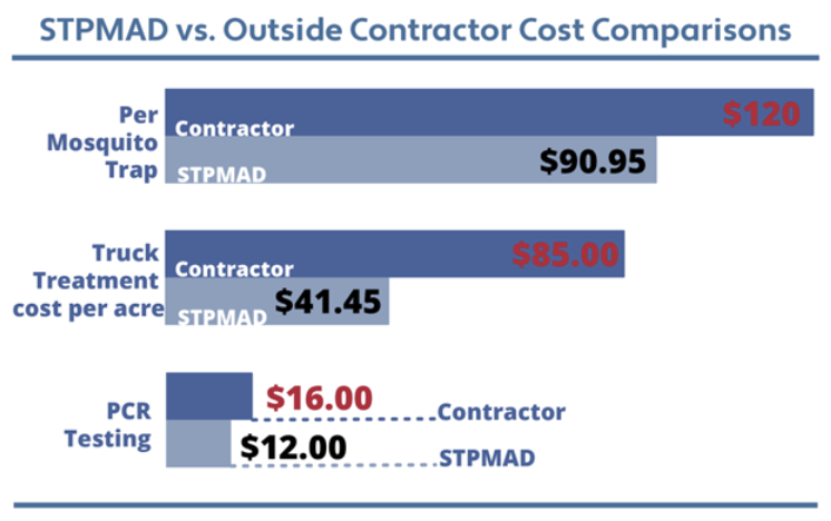 At the end of the day, hiring a private contractor for mosquito control services costs more, and provides less services at a lower quality. Comparatively, a contractor would cost $120 per mosquito trap, while STPMAD pays $90.95. Truck treatment per acre would cost $85 with a contractor, instead of $41.45 through STPMAD.