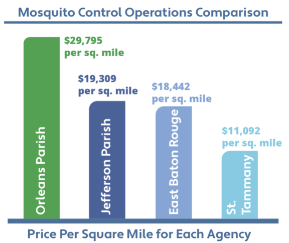 The main difference in need between St. Tammany and Jefferson Parish is size. St. Tammany is over 3.5 times larger than Jefferson, and our parish is much more rural. Because of our more spread-out population and suburban nature, we require more frequent and larger-area treatments. In fact, St. Tammany has one of the lowest prices per square mile for mosquito control at $11,092 per square mile, whereas Jefferson Parish sits at $19,309 per square mile.